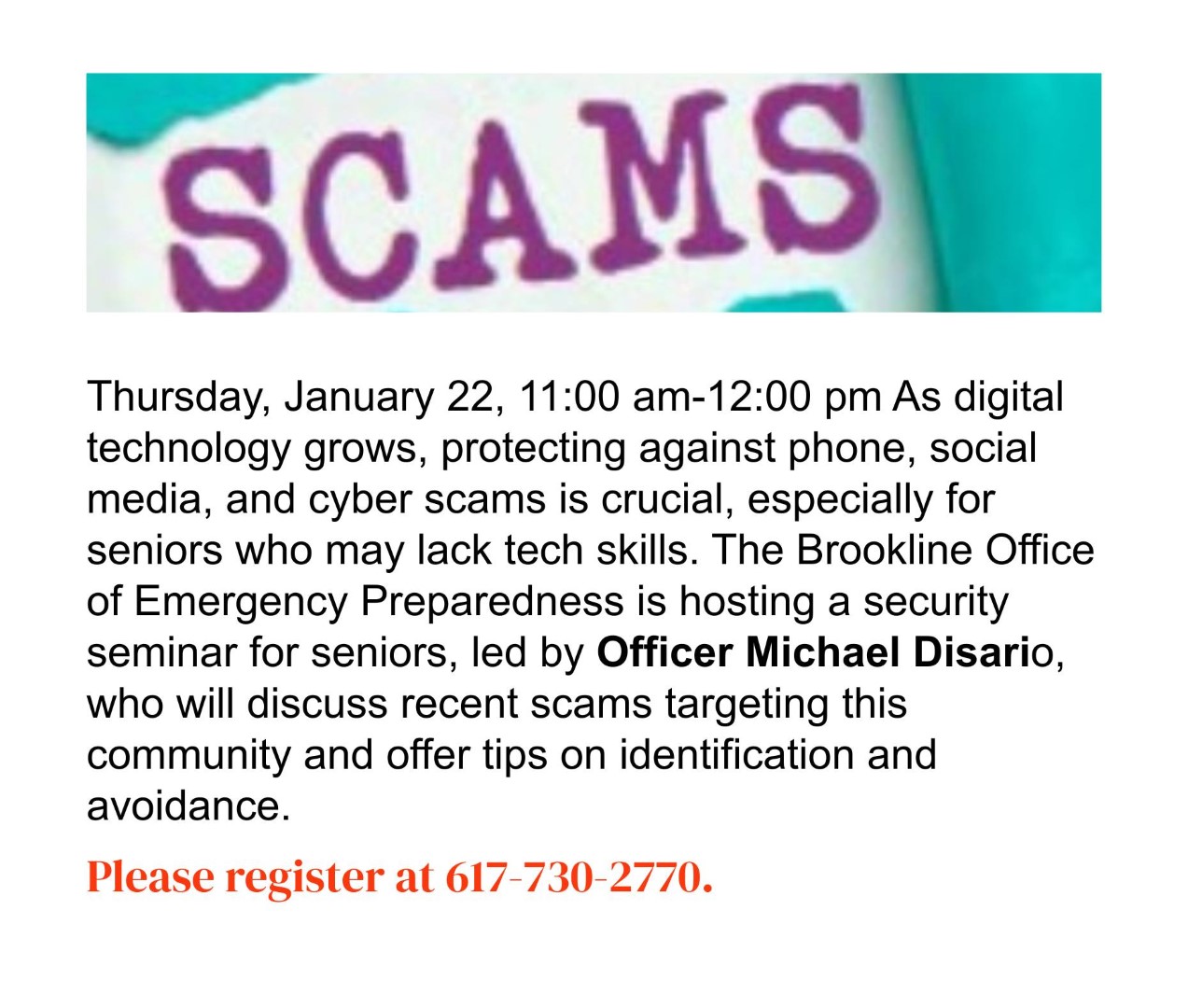 Financial Fraud and Scams Targeting Seniors with CFA Society Boston (Putterham) - Wednesday, January 7 at 11:00 AM